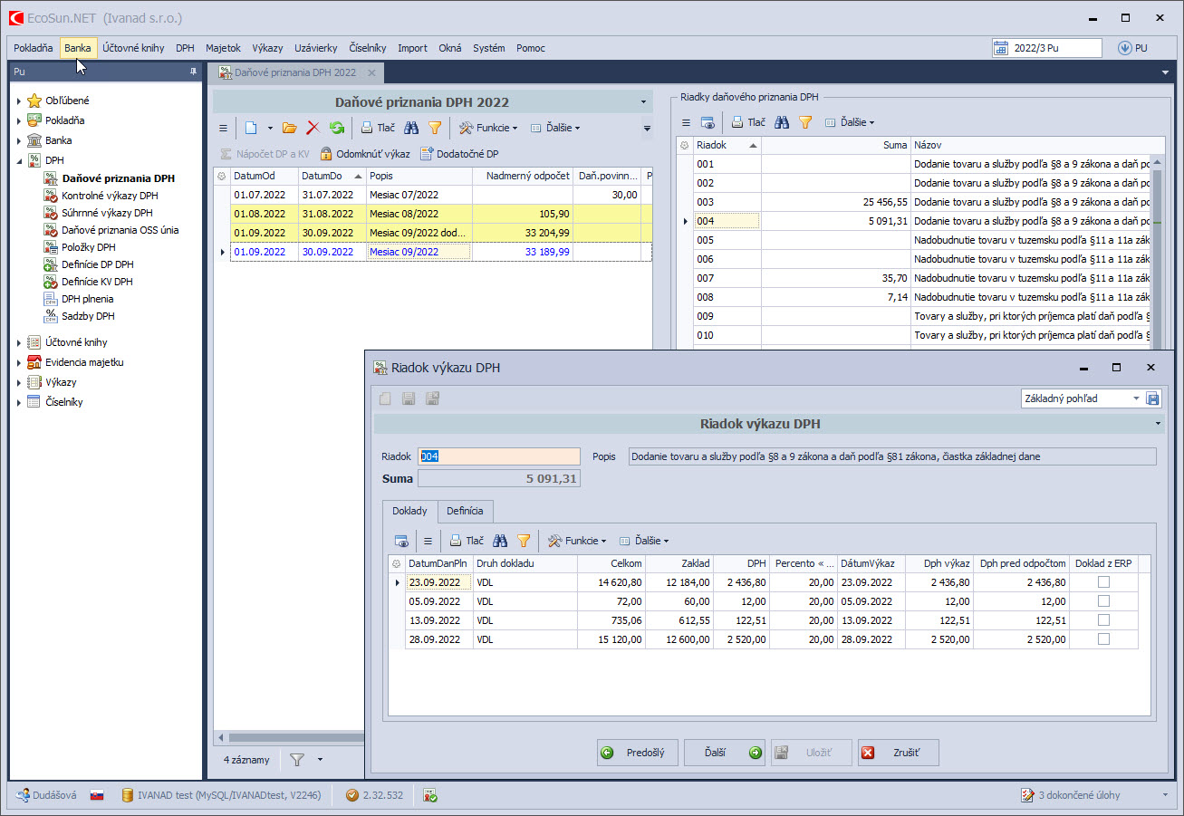 Ekonomický program umožní napočítanie riadnych a dodatočných výkazov DPH, KV, SV a OSS aj z nezaúčtovaných dokladov. Výkazy sa dajú napočítať v priebehu mesiaca priebežne toľko krát, koľko užívateľ potrebuje. Pomocou agendy Účtovníctva sa dajú veľmi jednoducho nahrať aj doklady s krátením DPH prípadne s koeficientom. Všetky výkazy je možné posielať priamo z ekonomického programu EcoSun na finančnú správu.