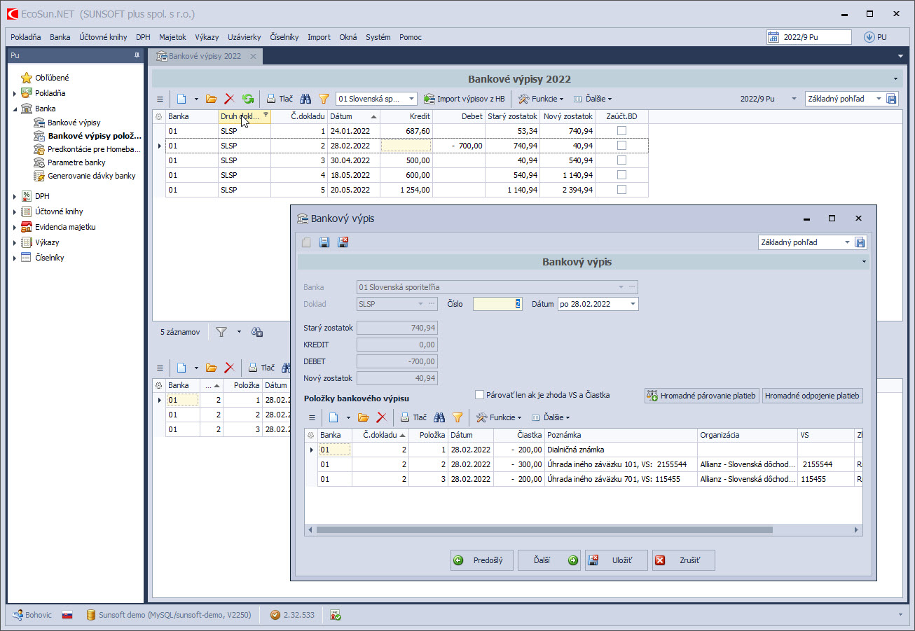 Elektronické načítanie bankových výpisov vám umožní do niekoľkých sekúnd zaevidovať aj niekoľkostranový bankový výpis. Modul banky v ekonomickom softvéri EcoSun poskytuje aj automatické párovanie platieb, rozdelenie jednej platby na viac úhrad a výpočet kurzových rozdielov.