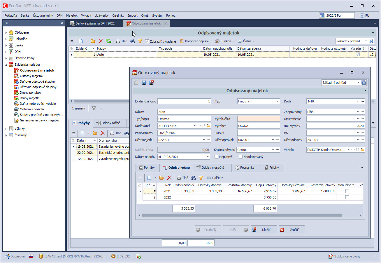 Agenda majetok v ekonomickom programe EcoSun vám zabezpečí prehľadnú evidenciu majetku. Výhodou je možnosť zadania rôznej vstupnej daňovej a účtovnej ceny. Ku kartám v ekonomickom softvéri si užívateľ môže priložiť doklady o nákupe, technickom zhodnotení, poprípade vyradení investičného majetku. Súčasťou agendy je aj daň z motorových vozidiel.