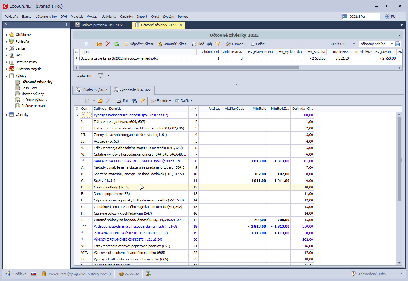 Modul Účtovníctvo ponúka daňové priznania k dani z príjmu, k dani z motorových vozidiel, k dani z pridanej hodnoty, kontrolný výkaz, súhrnný výkaz, výkaz OSS, účtovnú závierku spolu s poznámkami a cash flow. Výkazy viete z ekonomického programu EcoSun poslať priamo na stránku finančnej správy.