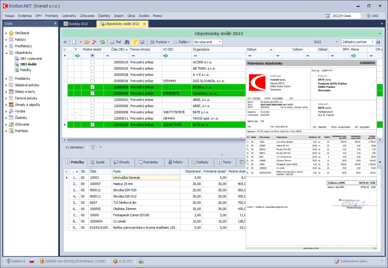 Jasný prehľad všetkých objednávok na jednom mieste. Okamžite viete, čo bolo odberateľovi už dodané a čo je ešte potrebné dodať. Objednávky vytvárajú rezervácie na sklade čo dáva okamžitý prehľad o disponibilnom tovare. Z objednávok je možné vytvoriť priamo dodacie listy alebo faktúry.