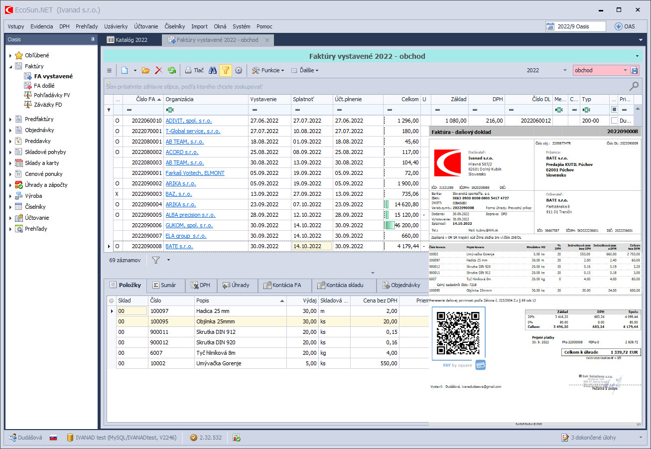 Prepracovaná agenda odberateľských faktúr zabezpečuje evidenciu vystavených faktúr a ich komfortné prepojenie s objednávkami a dodacími listami. Automatické zaradenie do DPH a účtovanie je samozrejmosťou. Vystavenú faktúru je možné hneď uložiť do PDF alebo odoslať mailom zákazníkovi.