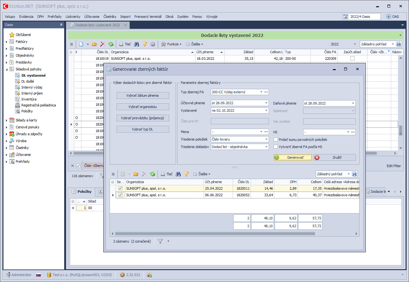 Rozšírením agendy vystavených faktúr sú súhrnné (zberné) faktúry. Na jeden klik vygenerujte celý rad zberných faktúr z vybraných dodacích listov. Vytlačená faktúra je prehľadne usporiadaná po dodacích listoch.