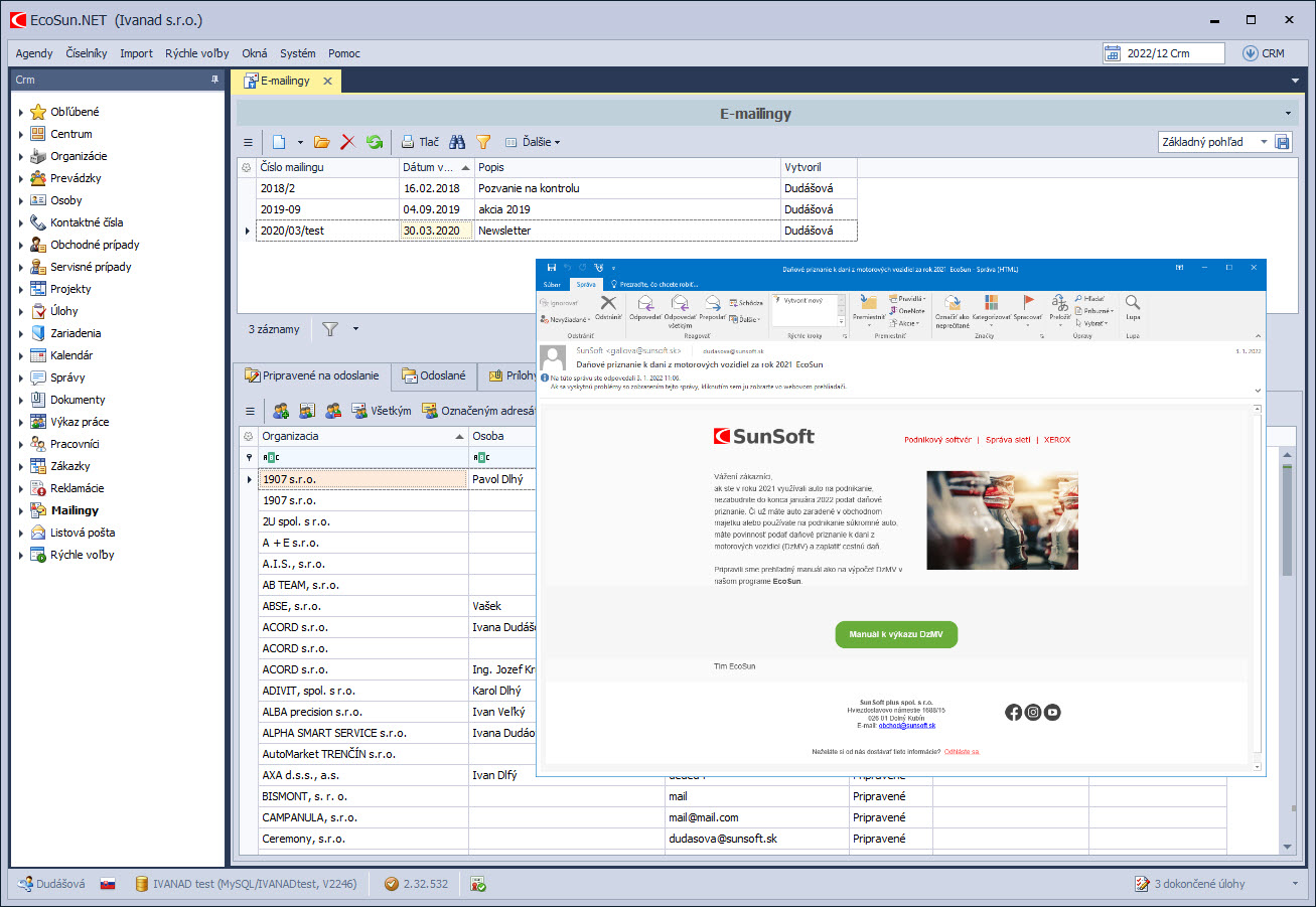 Užitočný modul pre obchodné a marketingové oddelenie. Jednoduchá tvorba kampaní, adresátov a obsahu emailov. CRM program podporuje jednotlivé aj hromadné rozposielanie emailov.