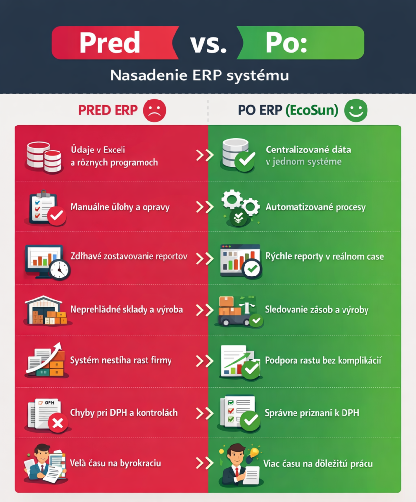 👉Riešenie: EcoSun automatizuje rutinné úlohy – fakturáciu, odpisy, DPH priznania aj plánovanie výroby. Tým uvoľní čas na strategickú prácu.